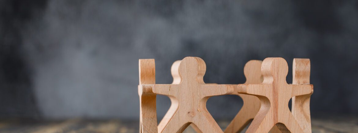 Business success and teamwork concept with wooden figures of people on wooden and foggy background side view.